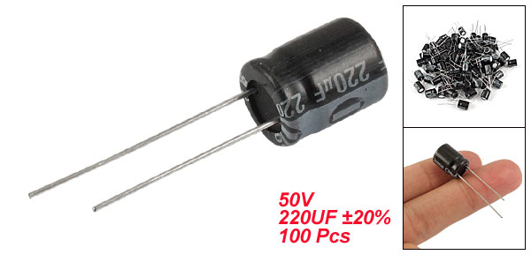 Product Name Aluminum Electrolytic Capacitor Type Radial Lead Maximum Temperature 105°C Voltage 50V Capacitance 220uF Capacitance Tolerance ±20% Body Size 10 x 13mm/0.39'' x 0.51'' (D*L) Lead Spacing 5mm/0.2'' Lead Length 26mm/1'', 22mm/0.87'' External Material Aluminum Weight 161g Color As Picture Shown Package Content 100 Pcs (±2%) x Electrolytic Capacitors - Reviews