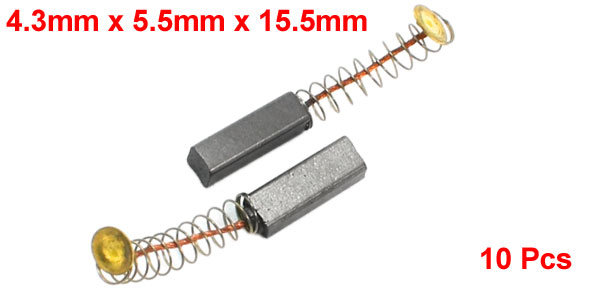 Details11/64" x 7/32" x 5/8" Electric Carbon Brush 10 Pcs  Product Name Carbon Brush Carbon Brush Size 4.3 x 5.5 x 15.5mm /11/64" x 7/32" x 5/8"(L*W*T) Total Length(Approx) 38mm/1.5'' Material Carbon, Metal Color Black, Gold Tone Net Weight 9g Package Content 10 x Carbon Brush