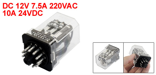 Details11 Pins 3PDT JTX-3C DC 12V Coil AC 220V/7.5A DC 24V/10A Power Relay  Product Name General Purpose Relay Model JTX-3C Coil Voltage DC 12V Contact Capacity 7.5A 220VAC 10A 24VDC Number of Pins 11 Contact 3PDT Size (Approx.) 6.6 x 3.4 x 3.5cm/2.5" x 1.3" x 1.3" (L*W*H) Shell Material Plastic Color Clear, Black Weight 66g Package Content 1 x General Purpose Relay