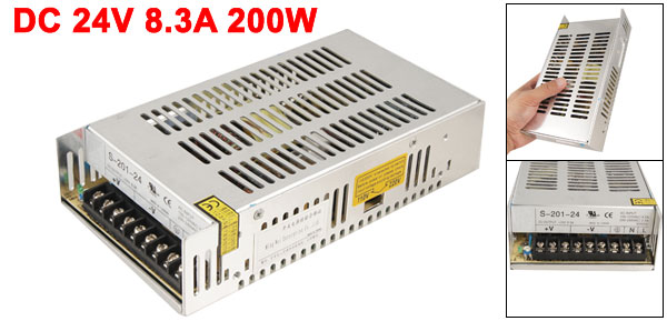Item Name Switching Power Supply Model No. S-201-24 Power Type Constant Voltage Input AC 100-120V, 4.5A, 50/60Hz AC 200-240V, 2.5A, 50/60Hz Output DC +24V, 8.3A DC Output Power 200W Size 21.5 x 11.4 x 5cm/ 8.5" x 4.5" x 2" (L*W*H) Case Material Metal Main Color Silver Tone Net Weight 772g Package Content 1 x Switching Power Supply - Reviews