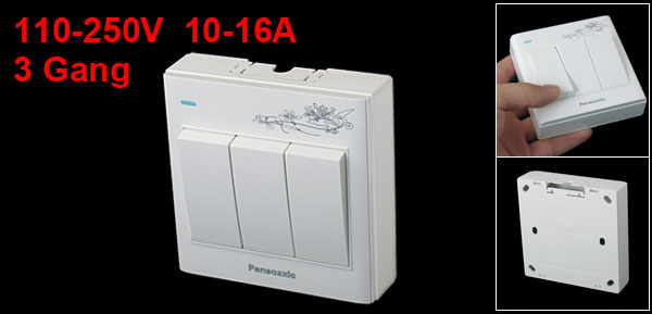 Product Name Wall Panel Switch Model MM-12 Material Plastic, Metal Color White Number of Gangs 3 Rated Voltage 110-250V Rated Current 10-16A Button Size 4.6 x 2.2cm/1.81" x 0.87"(L*W) Size 8.5 x 8.5 x 3cm/ 3.3" x 3.3" x 1.18"(L*W*T) Screw Hole Size 6.8 x 4.2mm/ 0.27" x 0.17"(L*W) Hole Size 67 x 67mm/2.64" x 2.64"(Centre to Centre) Weight 91g Package Content 1x Wall Panel Switch