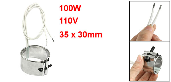 Product Name Band Heater Main Material Stainless Steel, Mica Power 100W Voltage 110V Cable Length 360mm/14.2" Size 35 x 30mm/ 1.4" x 1.2" (Inside Dia.*H) Overall Size 46 x 38 x 30mm/ 1.8" x 1.5" x 1.2" (L*W*H) Color Silver Tone Net Weight 66g Package Content 1 x Band Heater - Reviews