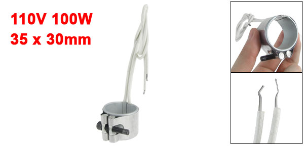 Details110V 100W 35 x 30mm Injected Mould Heating Element Band Heater  Product Name Band Heater Material Stainless Steel, Mica Power 100W Voltage 110V Band Size 35 x 30mm / 1.4" x 1.2" (Inner Dia.*H) Braid Lead Length (Each) 36cm / 14.2" Color White, Silver Tone Net Weight 66g Package Content 1 x Band Heater