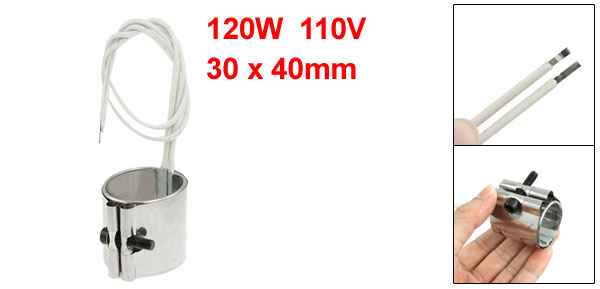 Product Name Band Heater Material Stainless Steel, Mica Power 120W Voltage 110V Band Size 30 x 40mm / 1.2" x 1.6" (Inner Dia.*H) Braid Lead Length (Each) 35cm / 13.8" Color White, Silver Tone Net Weight 73g Package Content 1 x Stainless Steel Band Heater - Reviews