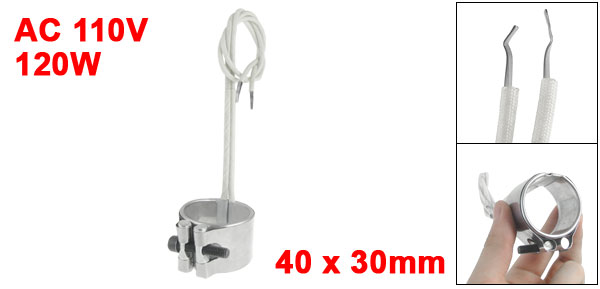 Product Name Band Heater Material Stainless Steel, Mica Power 120W Voltage 110V Band Size 40 x 30mm / 1.6" x 1.2" (Inner Dia.*H) Braid Lead Length (Each) 35.5cm / 14" Color White, Silver Tone Net Weight 72g Package Content 1 x Stainless Steel Band Heater - Reviews