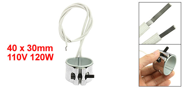 Product Name Band Heater Material Iron Sheethed, Mica Power 120W Voltage 110V Band Size 40 x 30mm / 1.6" x 1.2" (Inner Dia.*H) Braid Lead Length (Each) 35cm / 13.8" Color White, Silver Tone Net Weight 72g Package Content 1 x Iron Sheethed Band Heater - Reviews