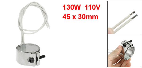 Product Name Band Heater Main Material Stainless Steel ,Mica Power 130W Voltage 110V Cable Length 340mm/13.4'' Size 45 x 30mm/1.8'' x 1.2'' (ID*H) Color White, Silver Tone Net Weight 76g Package Content 1 x Stainless Steel Band Heater - Reviews