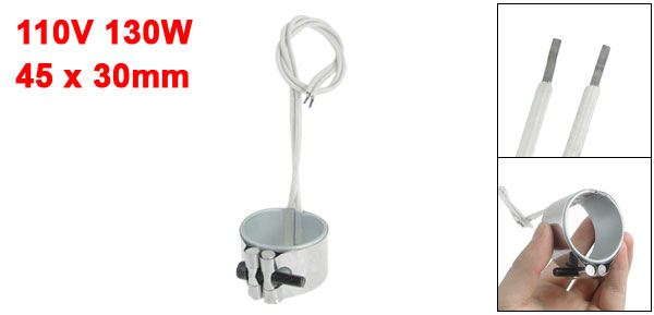Product Name Band Heater Material Stainless Steel, Mica Power 130W Voltage 110V Band Size 45 x 30mm / 1.77" x 1.2" (Inner Dia.*H) Braid Lead Length (Each) 37cm / 14.5" Color White, Silver Tone Net Weight 76g Package Content 1 x Stainless Steel Band Heater - Reviews