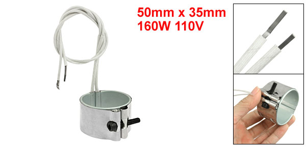 Product Name Band Heater Material Iron Sheethed, Mica Power 160W Voltage 110V Band Size 50 x 35mm / 2" x 1.4" (Inner Dia.*H) Braid Lead Length (Each) 35cm / 13.8" Color White, Silver Tone Net Weight 91g Package Content 1 x Iron Sheethed Band Heater - Reviews
