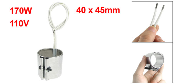 Product Name Band Heater Main Material Stainless Steel, Mica Power 170W Voltage 110V Cable Length 360mm/14.2" Size 40 x 45mm/1.6" x 1.8" (Inside Dia.*H) Overall Size 51 x 45 x 45mm/2" x 1.8" x1.8" (L*W*H) Color Silver Tone Net Weight 93g Package Content 1 x Band Heater - Reviews