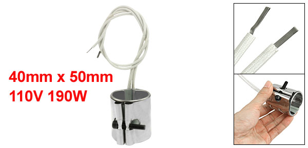Product Name Band Heater Material Stainless Steel, Mica Power 190W Voltage 110V Band Size 40 x 50mm / 1.6" x 2" (Inside Dia.*H) Braid Lead Length (Each) 35cm / 13.8" Color White, Silver Tone Net Weight 103g Package Content 1 x Band Heater - Reviews