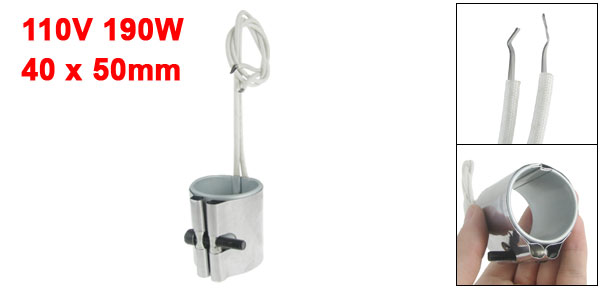 Product Name Band Heater Material Stainless Steel, Mica Power 190W Voltage 110V Band Size 40 x 50mm / 1.57" x 1.96" (Inner Dia.*H) Braid Lead Length (Each) 36cm / 14" Color White, Silver Tone Net Weight 103g Package Content 1 x Stainless Steel Band Heater - Reviews