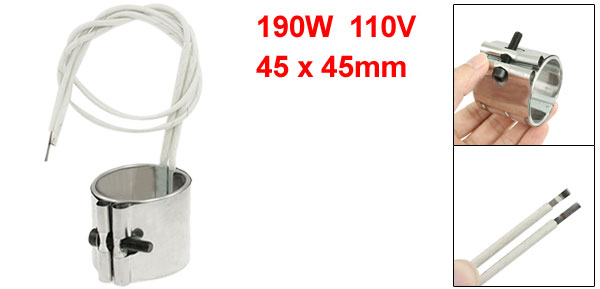 Product Name Band Heater Main Material Stainless Steel, Mica Power 190W Voltage 110V Cable Length 340mm/13.4'' Size 45 x 45mm/1.8'' x 1.8'' (ID*H) Color White, Silver Tone Net Weight 102g Package Content 1 x Stainless Steel Band Heater - Reviews