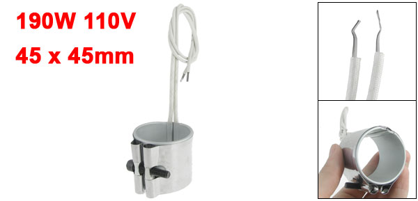Product Name Band Heater Material Stainless Steel, Mica Power 190W Voltage 110V Band Size 45 x 45mm / 1.8" x 1.8" (Inner Dia.*H) Braid Lead Length (Each) 37cm / 14.5" Color White, Silver Tone Net Weight 103g Package Content 1 x Stainless Steel Band Heater - Reviews