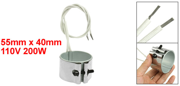Product Name Band Heater Main Material Iron Sheet, Mica Power 200W Voltage 110V Cable Length 340mm/13.4'' Size 55 x 40mm/2.2'' x 1.6'' (ID*H) Color White, Silver Tone Net Weight 100g Package Content 1 x Band Heater - Reviews