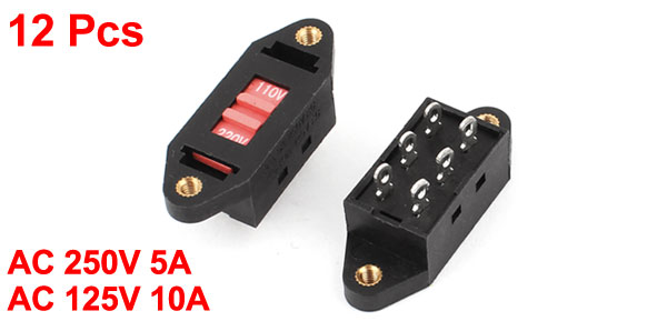 Main Color Black, Red Rating Voltage/Current AC 250V 5A, AC 125V 10A Country of Manufacture CHINA Hole Distance 34mm/1.3" Terminal Quantity 6 Material Plastic, Metal Contact Type DPDT Total Size 42 x 14 x 17mm/1.7" x 0.55" x 0.67"(L*W*H) Mount Hole Dia 3mm/0.12", M3 Product Name Slide Switch Net Weight 73g Package Content 12 x Slide Switch Position 3, 110V-Off-220V - Reviews