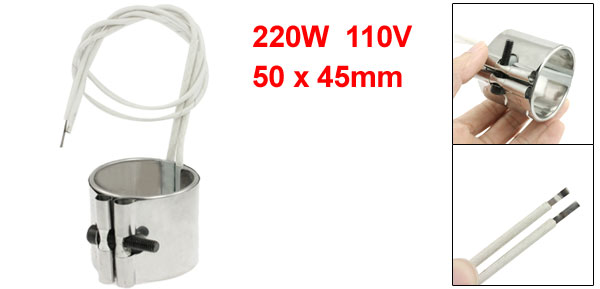 Product Name Band Heater Material Stainless Steel, Mica Power 220W Voltage 110V Band Size 50 x 45mm / 2" x 1.8" (Inner Dia.*H) Braid Lead Length (Each) 35cm / 13.8" Color White, Silver Tone Net Weight 109g Package Content 1 x Stainless Steel Band Heater - Reviews