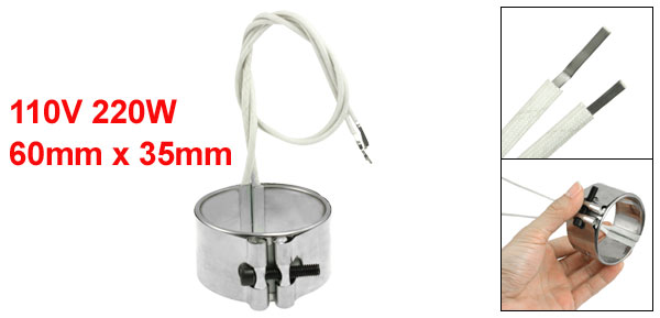 Product Name Band Heater Main Material Stainless Steel, Mica Power 220W Voltage 110V Cable Length 340mm/13.4'' Size 60 x 35mm/2.4'' x 1.8'' (ID*H) Color White, Silver Tone Net Weight 102g Package Content 1 x Stainless Steel Band Heater  - Reviews