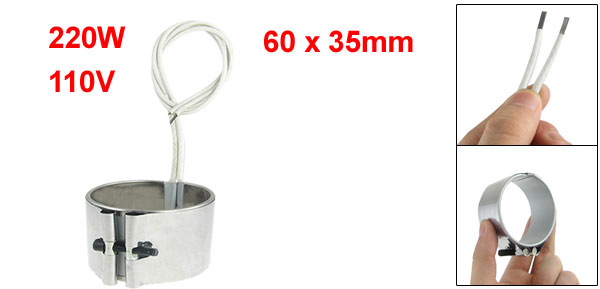 Product Name Band Heater Material Stainless Steel, Mica Power 220W Voltage 110V Band Size 60 x 35mm / 2.4" x 1.4" (Inner Dia.*H) Braid Lead Length (Each) 37cm / 14.6" Color White, Silver Tone Net Weight 101g Package Content 1 x Stainless Steel Band Heater - Reviews