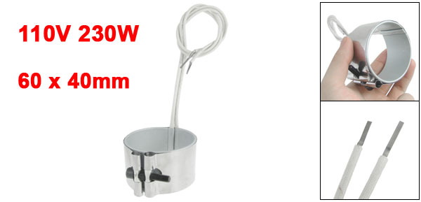 Product Name Band Heater Main Material Stainless Steel, Mica Power 230W Voltage 110V Cable Length 360mm/14.1'' Size 60 x 40mm/2.4'' x 1.6'' (Inner D*H) Color White, Silver Tone Net Weight 113g Package Content 1 x Stainless Steel Band Heater - Reviews
