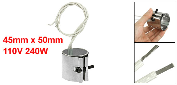 Product Name Band Heater Main Material Stainless Steel, Mica Power 240W Voltage 110V Cable Length 350mm/14'' Size 45 x 50mm/1.8'' x 2'' (ID*H) Color White, Silver Tone Net Weight 110g Package Content 1 x Stainless Steel Band Heater - Reviews