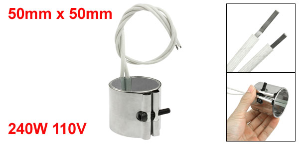 Product Name Band Heater Material Stainless Steel, Mica Power 240W Voltage 110V Band Size 50 x 50mm / 2" x 2" (Inside Dia.*H) Braid Lead Length (Each) 35cm / 13.8" Color White, Silver Tone Net Weight 120g Package Content 1 x Band Heater - Reviews
