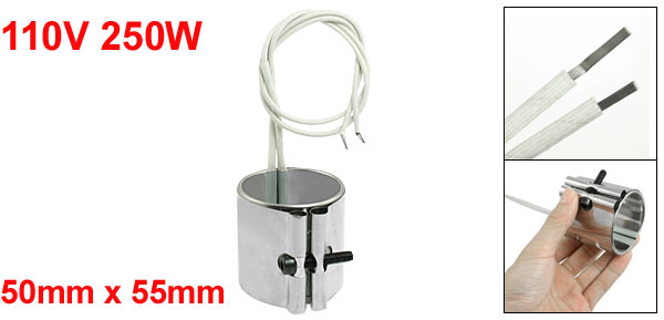 Product Name Band Heater Main Material Stainless Steel, Mica Power 250W Voltage 110V Cable Length 340mm/13.4'' Size 50 x 55mm/2'' x 2.2'' (ID*H) Color White, Silver Tone Net Weight 129g Package Content 1 x Stainless Steel Band Heater - Reviews