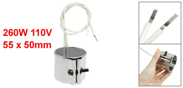 Product Name Band Heater Material Stainless Steel, Mica Power 260W Voltage 110V Band Size 55 x 50mm / 2.2" x 2" (Inner Dia.*H) Braid Lead Length (Each) 35cm / 13.8" Color White, Silver Tone Net Weight 127g Package Content 1 x Stainless Steel Band Heater - Reviews