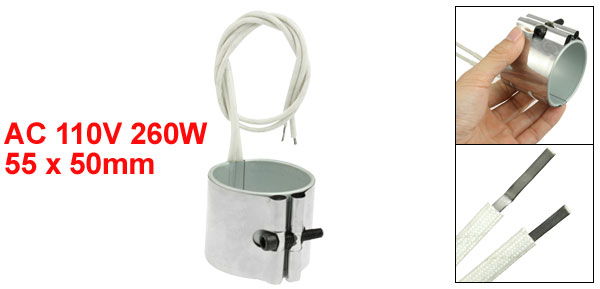Product Name Band Heater Material Iron Sheethed, Mica Power 260W Voltage 110V Band Size 55 x 50mm / 2.2" x 2" (Inner Dia.*H) Braid Lead Length (Each) 35cm / 13.8" Color White, Silver Tone Net Weight 128g Package Content 1 x Iron Sheethed Band Heater  - Reviews