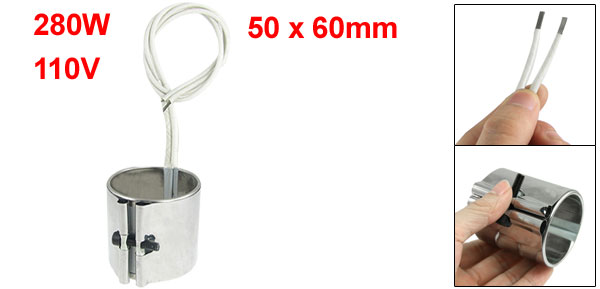 Product Name Band Heater Main Material Stainless Steel, Mica Power 280W Voltage 110V Cable Length 360mm/14.2" Size 50 x 60mm/ 2" x 2.4" (Inside Dia.*H) Overall Size 65 x 54 x 60mm/ 2.6" x 2.1" x 2.4" (L*W*H) Color Silver Tone Net Weight 137g Package Content 1 x Band Heater - Reviews