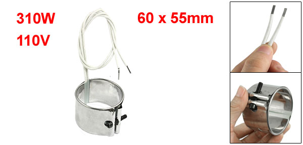 Product Name Band Heater Main Material Stainless Steel, Mica Power 310W Voltage 110V Cable Length 360mm/14.2" Size 60 x 55mm/2.4" x 2.2" (Inside Dia.*H) Overall Size 74 x 64 x 55mm/ 2.9" x 2.5" x 2.2" (L*W*H) Color Silver Tone Net Weight 147g Package Content 1 x Band Heater  - Reviews