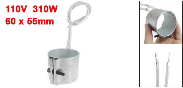 Product Name Band Heater Material Stainless Steel, Mica Power 310W Voltage 110V Band Size 60 x 55mm / 2.4" x 2.2" (Inner Dia.*H) Braid Lead Length (Each) 37cm / 14.5" Color White, Silver Tone Net Weight 164g Package Content 1 x Stainless Steel Band Heater - Reviews