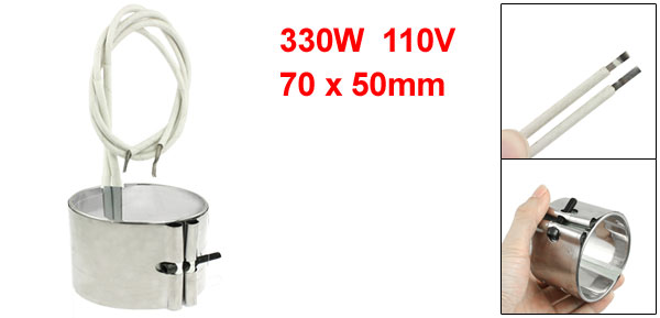 Product Name Band Heater Main Material Stainless Steel, Mica Power 330W Voltage 110V Cable Length 360mm/14.2" Size 70 x 50mm/2.8" x 2" (Inside Dia.*H) Color Silver Tone Net Weight 155g Package Content 1 x Band Heater - Reviews