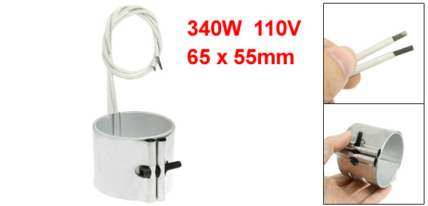 Product Name Band Heater Material Iron Sheet, Mica Power 340W Voltage 110V Band Size 65 x 55mm / 2.6" x 2.2" (Inside Dia.*H) Braid Lead Length (Each) 35cm / 13.8" Color White, Silver Tone Net Weight 159g Package Content 1 x Band Heater - Reviews