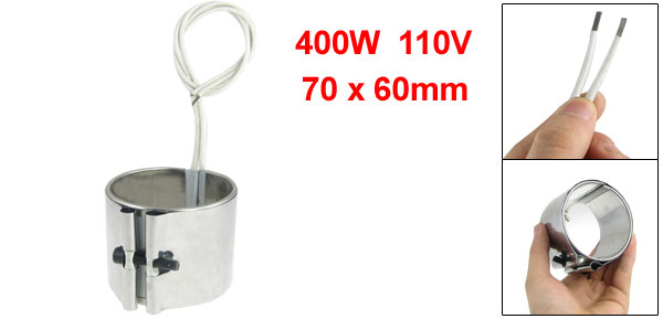 Product Name Band Heater Main Material Stainless Steel, Mica Power 400W Voltage 110V Cable Length 360mm/14.2" Size 70 x 60mm/2.8" x 2.4" (Inside Dia.*H) Overall Size 81 x 74 x 60mm/3.2" x 2.9" x 2.4" (L*W*H) Color Silver Tone Net Weight 180g Package Content 1 x Band Heater - Reviews