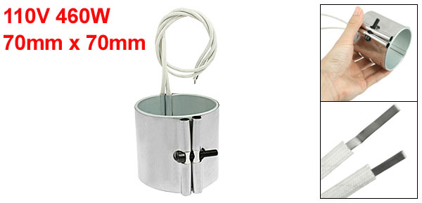 Product Name Band Heater Material Iron Sheet, Mica Power 460W Voltage 110V Band Size 70 x 70mm / 2.7" x 2.7" (Inside Dia.*H) Braid Lead Length (Each) 35cm / 13.8" Color White, Silver Tone Net Weight 207g Package Content 1 x Band Heater - Reviews