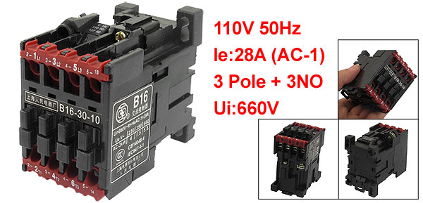 Product Name AC Contactor Model Number B16-30-10 Material Plastic, Metal, Electrical Parts Coil Voltage 110V 50Hz Ui 660V Ue 660V Ith 28A Ie 28A (AC-1) Power 5.5KW(AC-3) Number of Contact 3 Pole + 3NO Terminals Number 4 Screw Terminals Overall Size (Approx.) 8.2 x 7.1 x 4.4cm/3.23" x 2.8" x 1.73 (L*W*T) Mounting Size 35mm Mounting Rail Color Black Net Weight 304g Package Content 1 x AC Contactor - Reviews