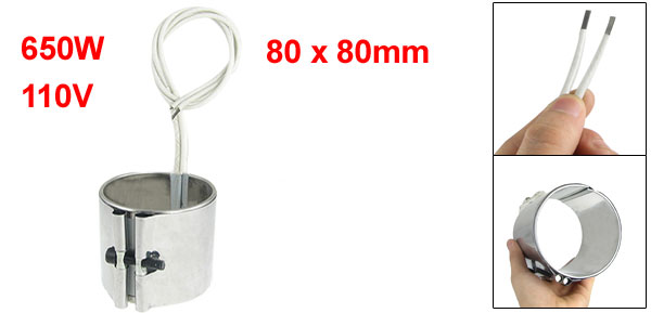 Product Name Band Heater Main Material Stainless Steel, Mica Power 650W Voltage 110V Cable Length 360mm/14.2" Size 80 x 80mm/ 3.1" x 3.1" (Inside Dia.*H) Overall Size 93 x 86 x 80mm/ 3.7" x 3.4" x 3.1" (L*W*H) Color Silver Tone Net Weight 126g Package Content 1 x Band Heater - Reviews