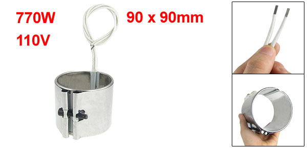 Product Name Band Heater Main Material Stainless Steel, Mica Power 770W Voltage 110V Cable Length 360mm/14.2" Size 90 x 90mm/ 3.5" x 3.5" (Inside Dia.*H) Overall Size 103 x 94 x 90mm/ 4" x 3.7" x 3.5" (L*W*H) Color Silver Tone Net Weight 335g Package Content 1 x Band Heater - Reviews