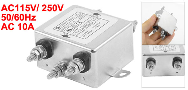 Product Name AC Power Line EMI Filter Model No. CW3L2-10A-S Working Voltage AC115V/ 250V, 50/60Hz Rated Current AC 10A Working Temperature 40C Installing Hole Size(Approx) Distance: 63mm / 2.5"