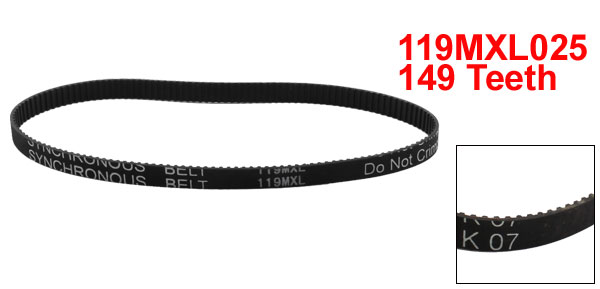 Product Name Timing Belt Model 119MXL025 Number of Teeth 149 Pitch 2.032mm / 0.08" Belt Width 6.4mm / 0.25" Pitch Line Length 302.77mm/12" Material Rubber Color Black Weight 5g Package Content 1 x Timing Belt - Reviews