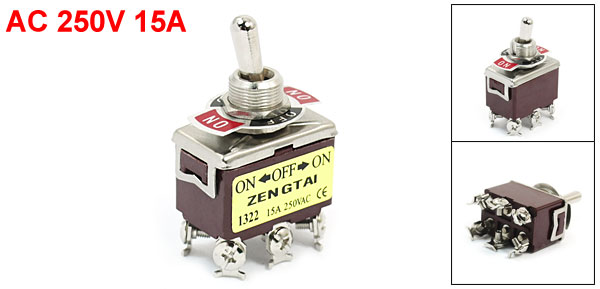 Details11mm Panel Mount DPDT ON/OFF/ON 3 Position Toggle Switch AC 250V 15A E-TEN1322  Product Name Toggle Switch Model E-TEN1322 Type DPDT (Latching) Position 3 Positions (ON/OFF/ON) Voltage, Current AC 250V 15A Mounting Thread Diameter 11 mm / 0.43" Main Body Size 3 x 2 x 2.1 cm / 1.2" x 0.8" x 0.8" (L*W*H) Overall Height 5.8cm / 2.3" Net Weight 40g Package Content 1 x Toggle Switch