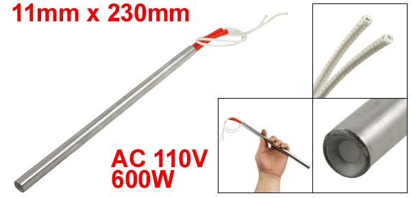 Product Name Cartridge Heater Material Stainless Steel, PVC, Nylon Rated Voltage AC 110V Power 600W Heater Size (Approx.) 11 x 230mm / 0.43" x 9.1" (D*L) Wire Length (Approx.) 29cm / 11.4" Color Silver Tone, Red, White Weight 96g Package Content 1 x Cartridge Heater - Reviews