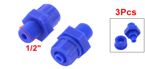 Details12.5mm Threaded Blue Plastic Air Straight Pipe Connector Fitting 3 Pcs  Product Name Pneumatic Connector Fitting Model BMC10-02 Thread Diameter 12.5mm/ 1/2" Fit Hose Diameter 6 x 8mm/ 0.24" x 0.31" (OutterD*InnerD) Length 3.2cm/ 1.25" Hex Side to Side Size 14.6mm/ 0.6" Material Plastic Color Blue Weight 20g Package Content 3 x Pneumatic Connector Fitting