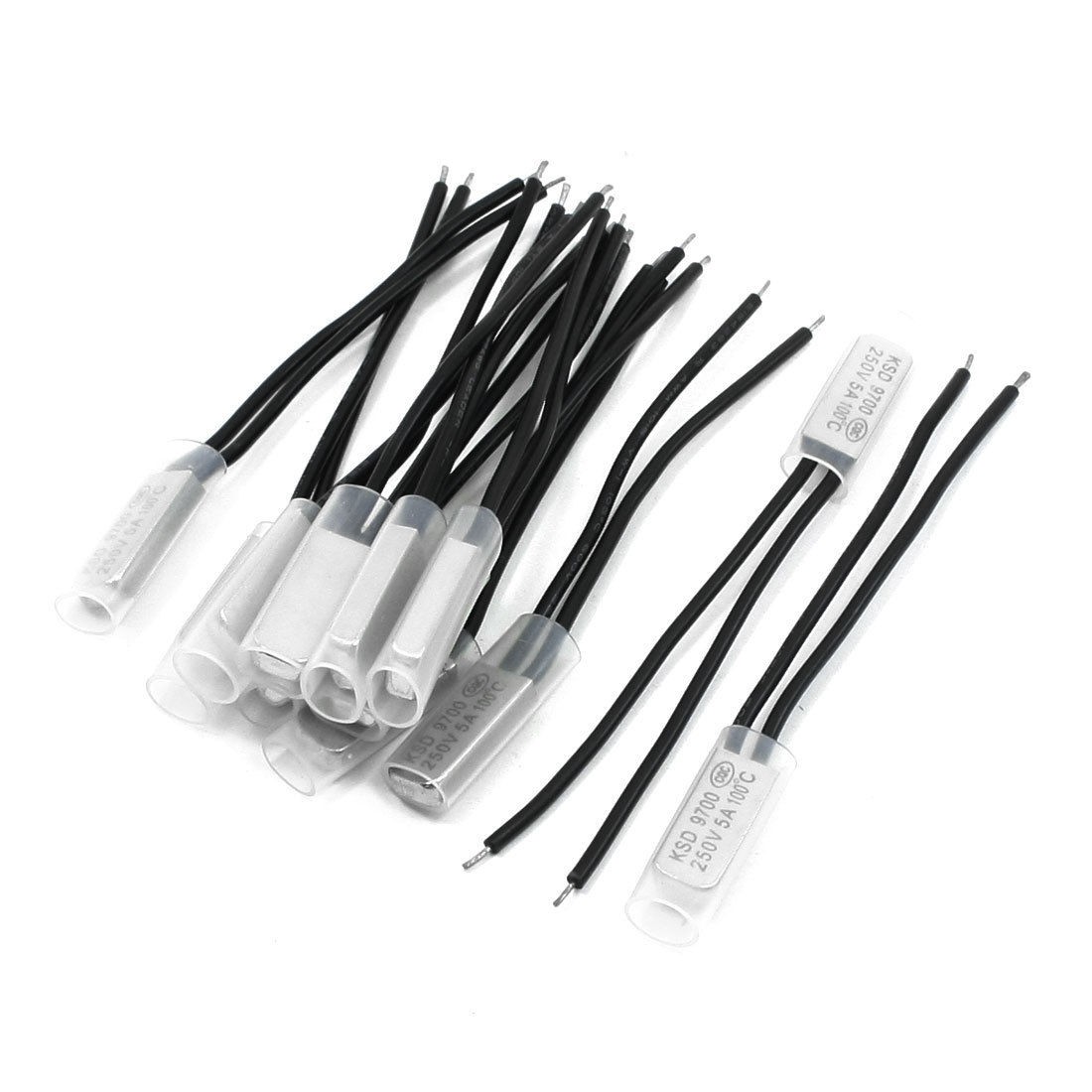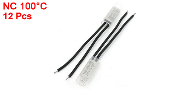 Rated Power 250V 5A Active Temperature 100°C Lead Wire Length 7.3cm / 2.9" Head Dimension 20 x 7.5 x 3.5mm/0.78" x 0.3" x 0.14"(L*W*T) Material Bimetal ,Plastic,Stainless Steel Main Color Silver Tone, Black Net Weight 38g Package Content 12 PCS x Temperature Control Switch - Reviews