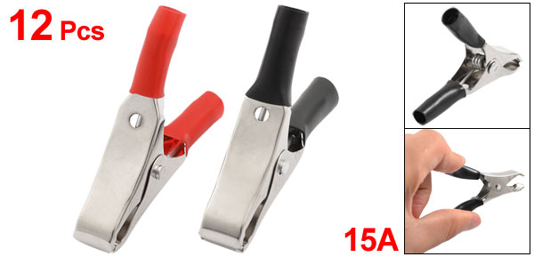 Product Name Alligator Clip Material Soft Plastic, Metal Color Black, Red, Silver Tone Rated Current 15A Overall Size(Each) 53 x 45 x 10mm / 2.1" x 1.8" x 0.4"(L*W*T) Jaw Open Width 17mm / 0.669"(Max.) Weight 73g Package Content 12 x Alligator Clips - Reviews