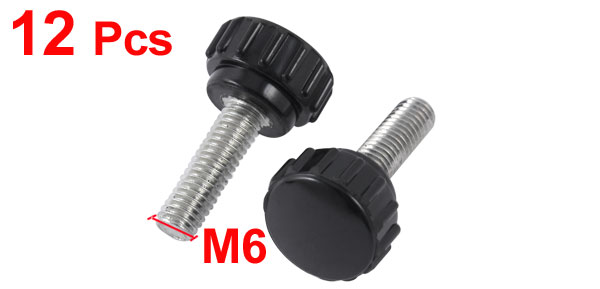 Product Name Knurled Knob Type Screw On Head Diameter 18mm / 0.7" Male Thread Length 20mm / 0.8" Male Thread Diameter M6 Total Height 30mm / 1.2" Material Metal, Plastic Color Silver Tone, Black Net Weight 96g Package Content 12 x Knurled Knobs - Reviews
