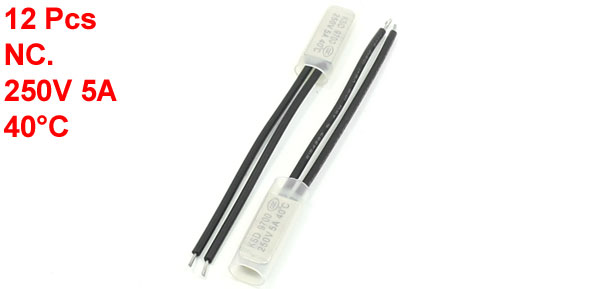 Rated Power 250V 5A Active Temperature 40°C Lead Wire Length 7.3cm / 2.9" Head Dimension 20 x 7.5 x 3.5mm/0.78" x 0.3" x 0.14"(L*W*T) Material Bimetal ,Plastic,Stainless Steel Main Color Silver Tone, Black Net Weight 38g Package Content 12PCS x Temperature Control Switch - Reviews