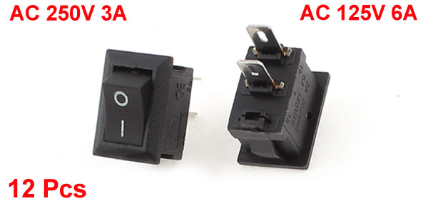 Product Name Rocker Switch Material Plastic, Metal Type On Off, SPST Terminals Number 2 Rating Voltage AC 250V 3A /AC 125V 6A Total Size(Each) 1.5 x 1 x 1.8cm/ 0.6" x 0.4" x 0.7"(L*W*H) Mounted Size 8 x 8 x 16mm/ 0.3" x 0.3" x 0.63" (L*W*H) Color Black,Silver Tone Total Weight 18g Package Content 12 x Rocker Switches - Reviews