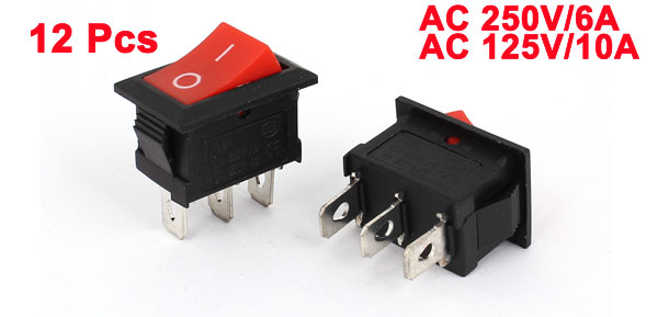 12 Pcs Mini Red Snap-in SPDT ON-OFF Rocker Switch KCD1 AC 250V/6A 125V/10A
